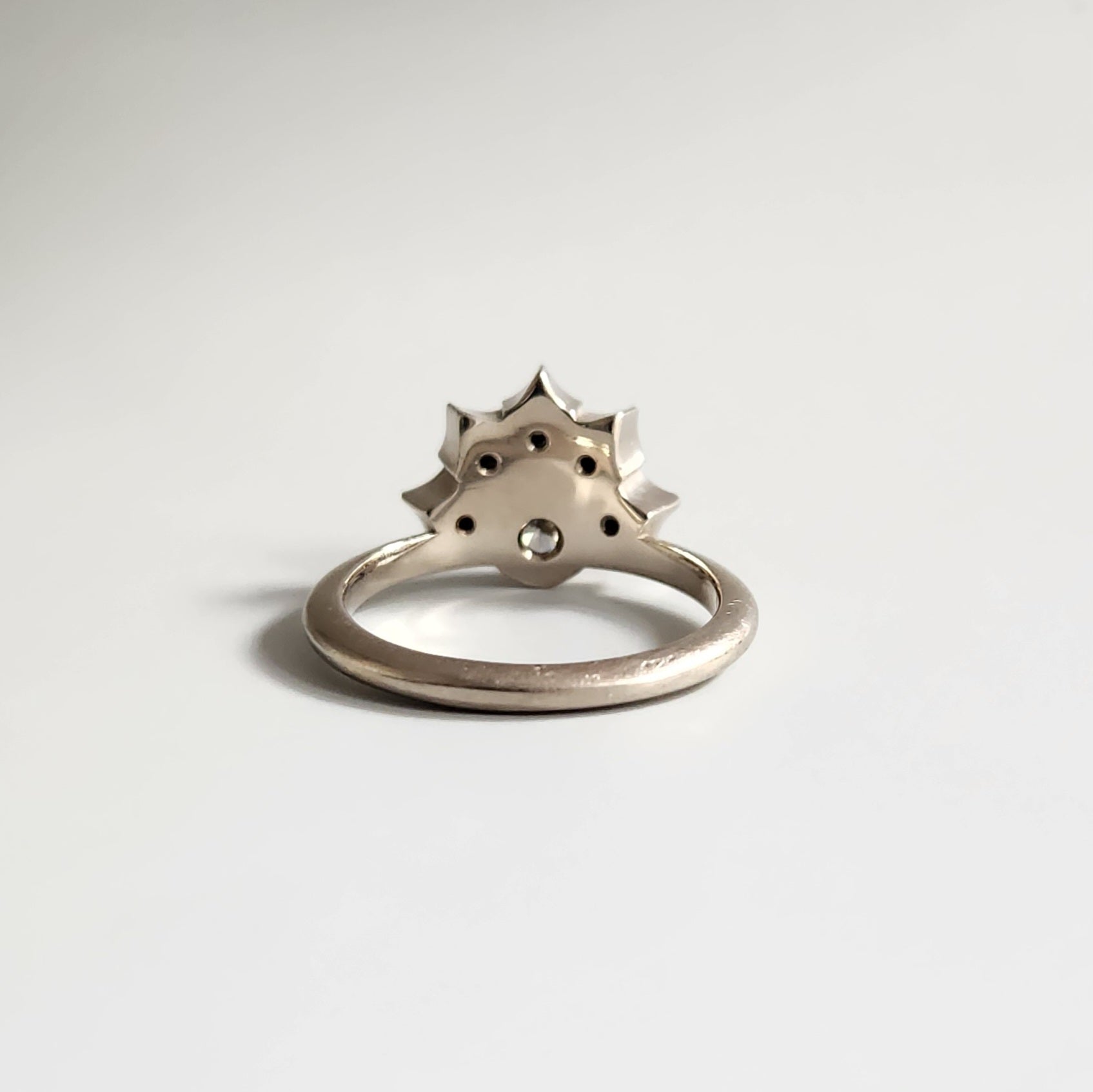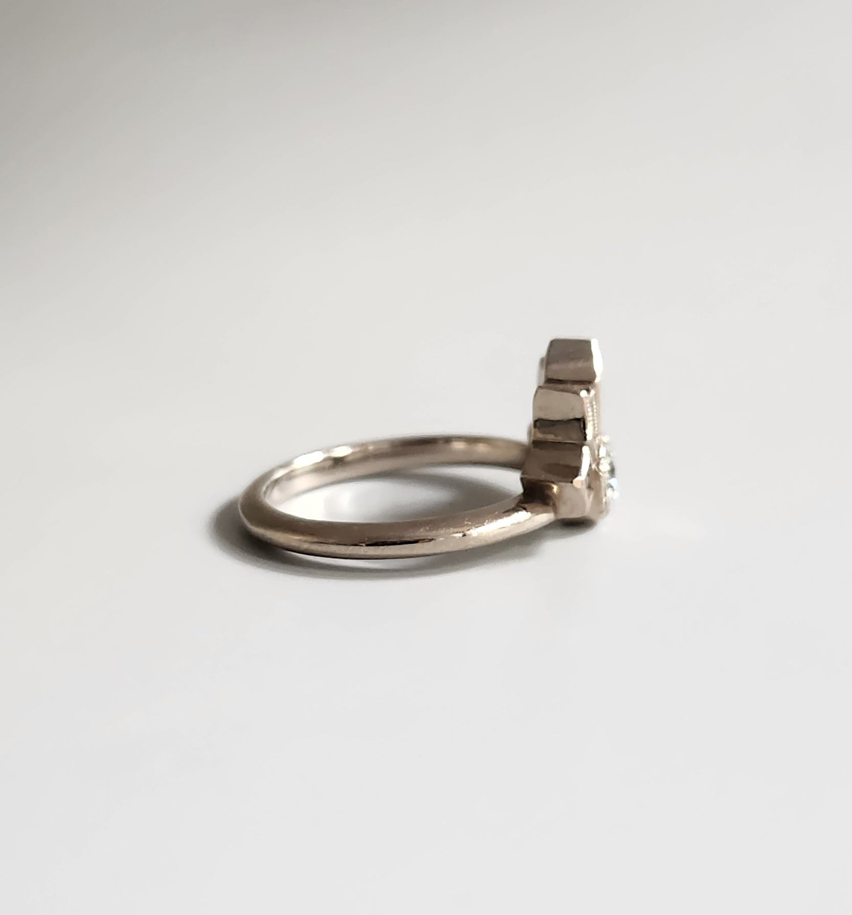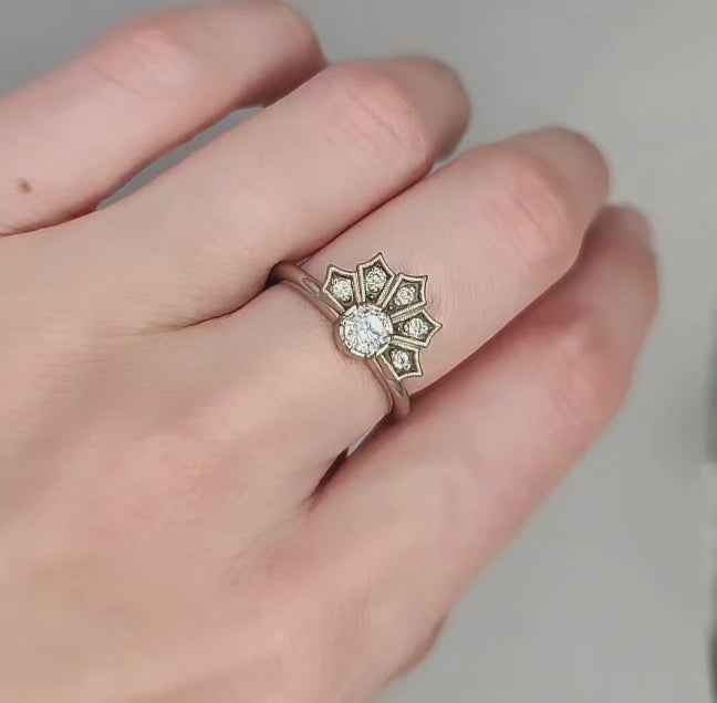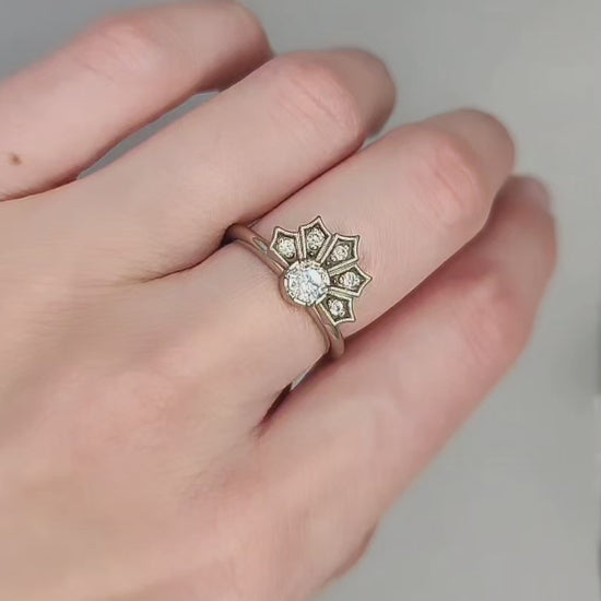 This exquisite, modern art-deco style ring by Chelsea Swank is crafted from 14ct white gold (hallmarked 14k rhodium white gold). It features a brilliant 5mm central moissanite, elegantly framed by five 1.7mm diamonds set in a striking fan formation.