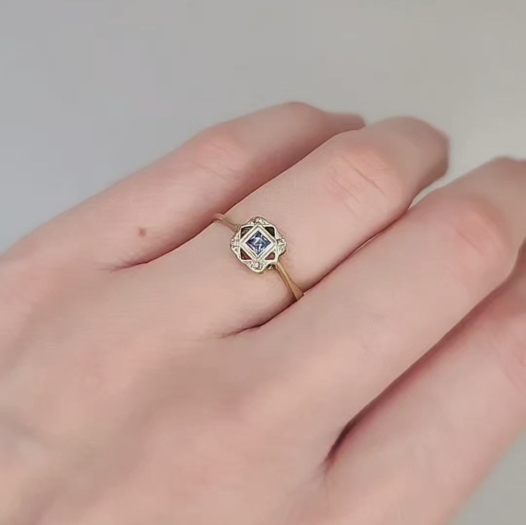 This exquisite antique Edwardian ring is masterfully crafted from polished 14k yellow gold and features a striking square-cut pale blue sapphire as its centerpiece. Intricate filigree detailing radiates from the center, accented by four brilliant 1mm diamonds delicately set at each cardinal point.