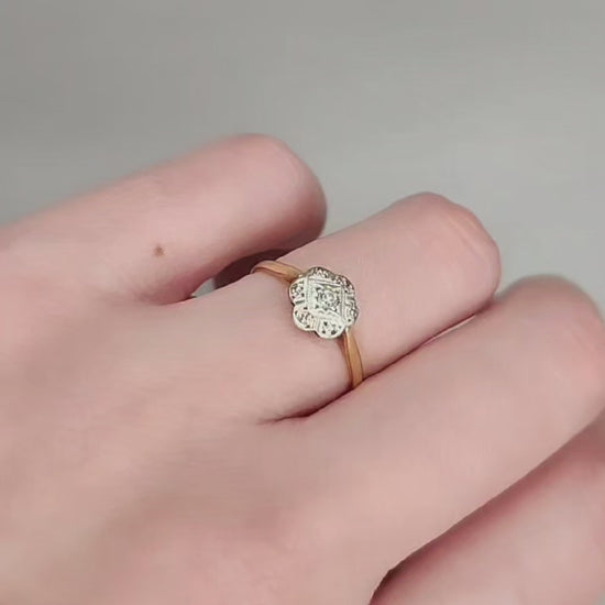Crafted in luxurious 18ct gold (hallmarked), this dainty Edwardian daisy ring exudes timeless elegance. The ring features a central, dazzling 1.8mm diamond, encircled by six meticulously set 1mm chip diamonds. These surround the central stone in a delicate, floral arrangement. The intricate, engraved setting showcases the exquisite craftsmanship characteristic of the Edwardian era. With a diameter of 7.8mm, this ring offers a subtle yet captivating sparkle, perfect for adding a touch of vintage charm to any ensemble.