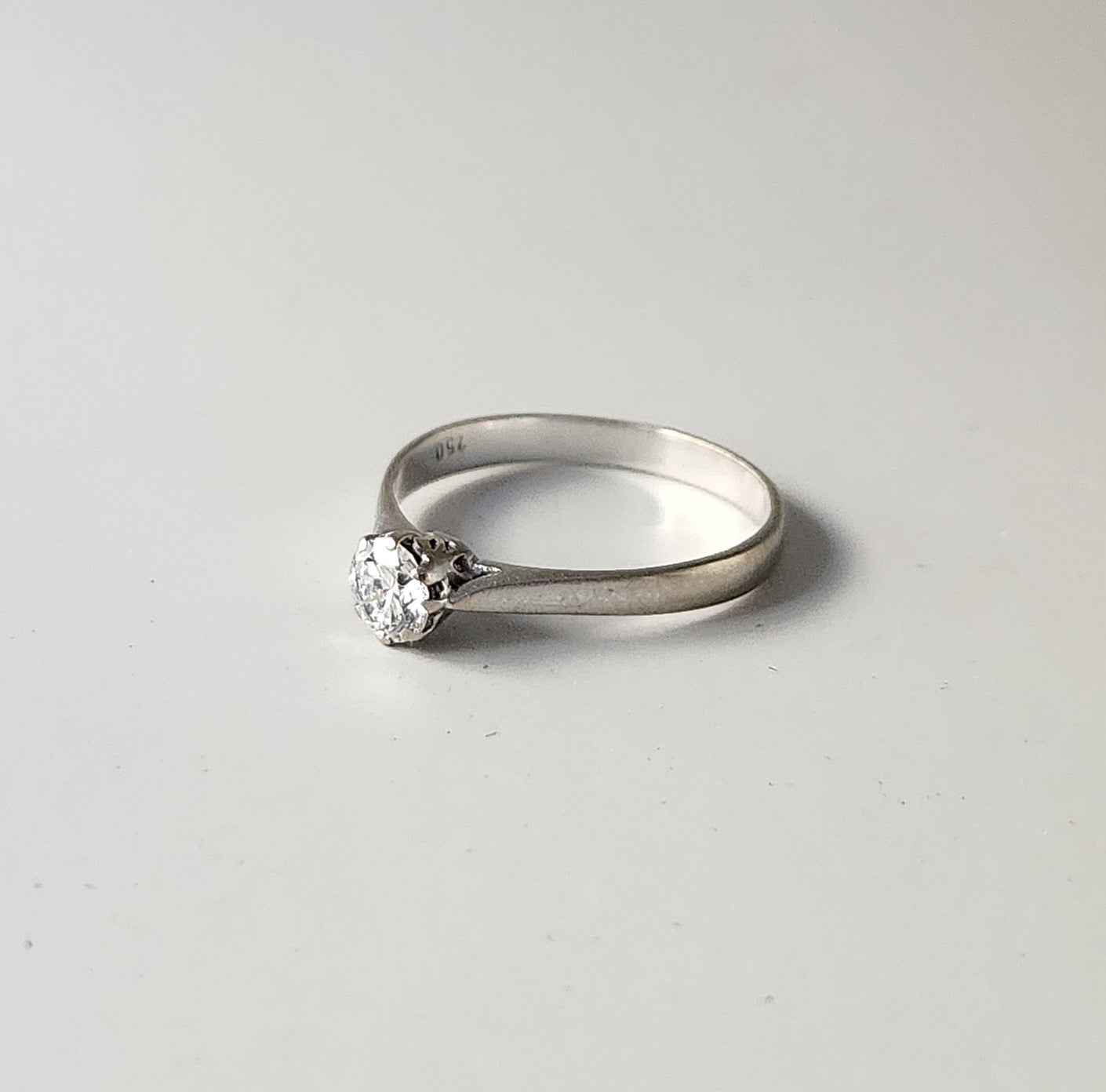 This hallmarked vintage 18ct white gold solitaire ring features a stunning 0.5 carat classic diamond, measuring 5mm in diameter, secured in a timeless prong setting. Loved in its lifetime, the centerpiece remains a captivating and high-quality brilliant-cut stone.