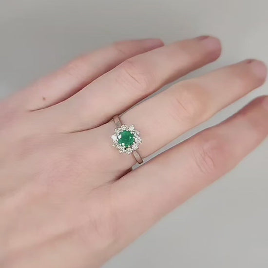 This exquisite ring showcases a stunning emerald, radiating a rich, green hue. The central 5.5mm emerald is beautifully framed by a cluster of ten shimmering 2mm diamonds, creating a dazzling halo effect.