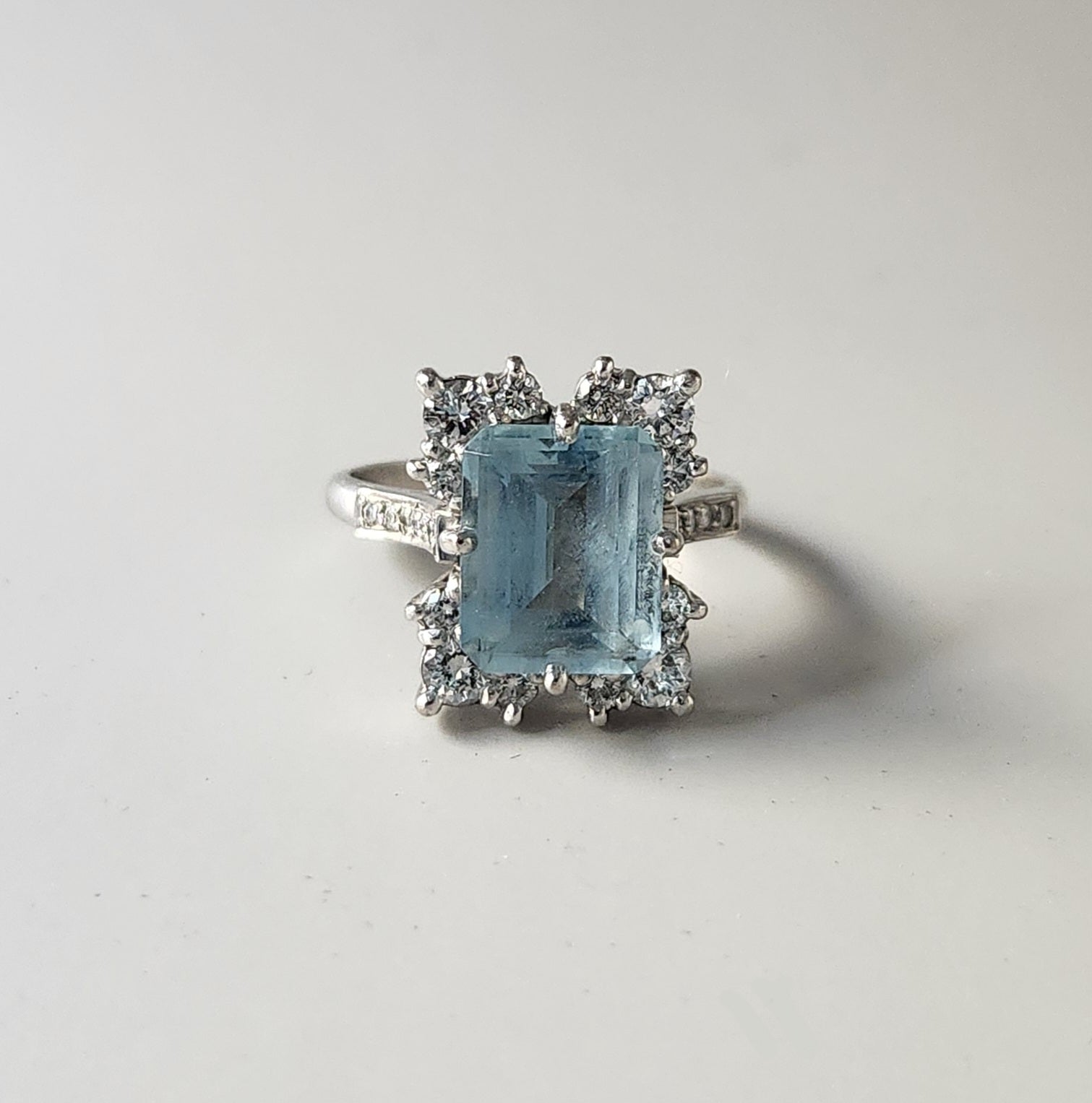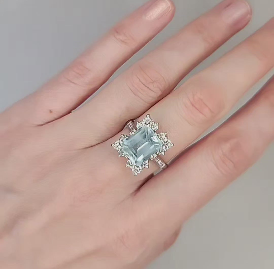 18ct White Gold Vintage 4 Carat Emerald Cut Aquamarine & Diamond Ring