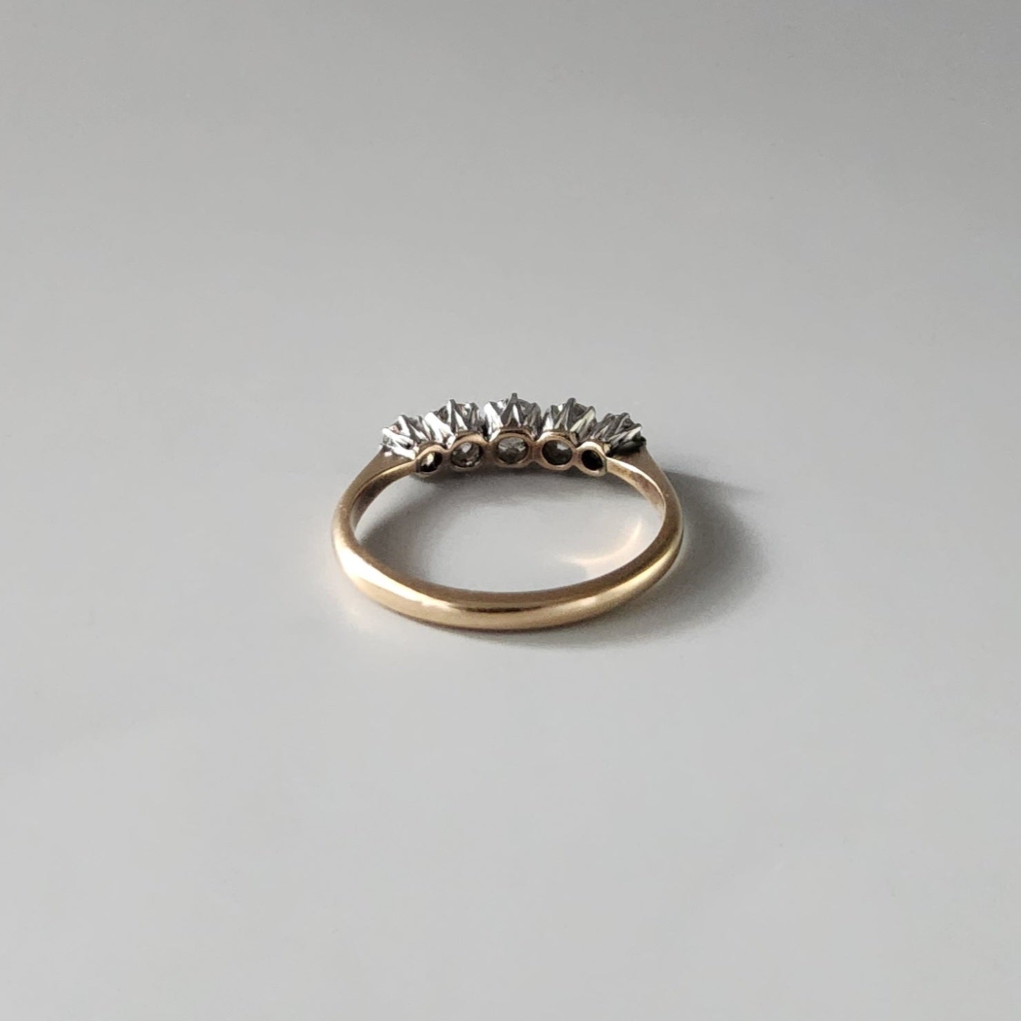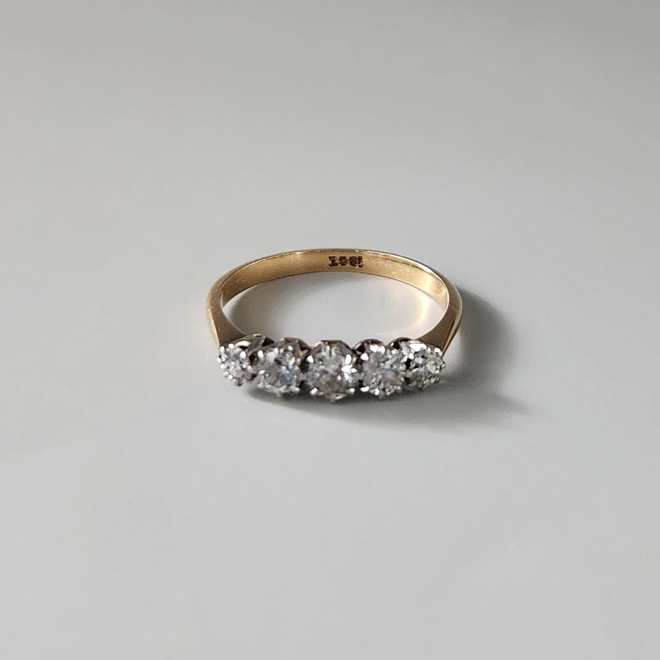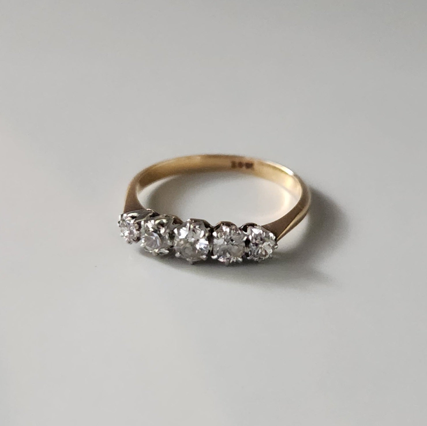 Introducing our exquisite 18 carat gold antique ring, adorned with five dazzling diamonds set in delicate claw settings. This timeless piece exudes elegance and grace, capturing the essence of vintage charm while adding a touch of modern sophistication. Crafted with the utmost precision and attention to detail, this ring showcases the beauty of 18 carat gold, renowned for its stunning luster and durability. This classic five stone diamond ring features approximately 0.4 carats of bright sparkling diamonds.