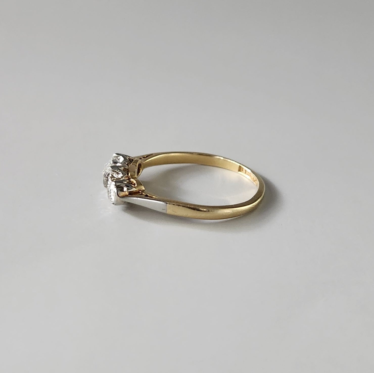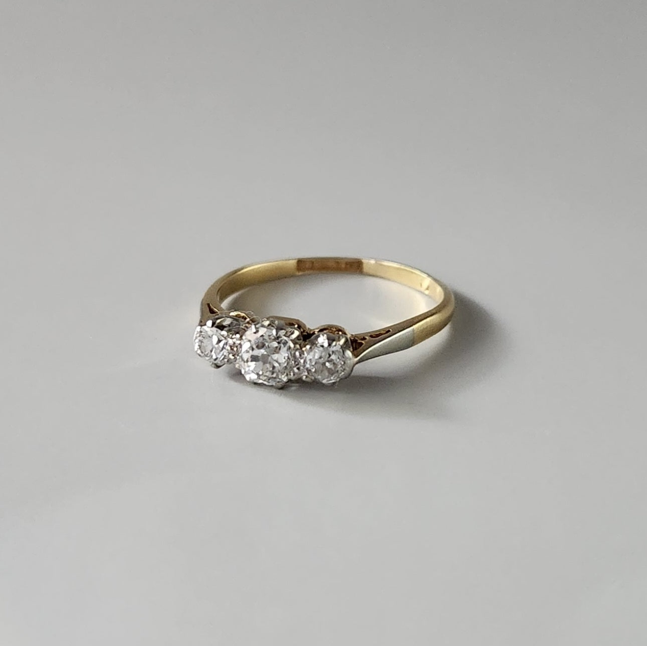 Introducing our exquisitely crafted Antique Ring, a true masterpiece that effortlessly captures the elegance and allure of bygone eras. This timeless creation features a luxurious 18ct yellow gold band, expertly handcrafted to provide a regal and refined foundation for the beauty that awaits. Nestled in the heart of this magnificent ring are three breathtaking, hand-cut diamonds, each meticulously chosen to radiate brilliance and sparkle from every angle. These exceptional diamonds are expertly set within a platinum trilogy setting, a combination that enhances their natural allure and magnifies their luminosity.