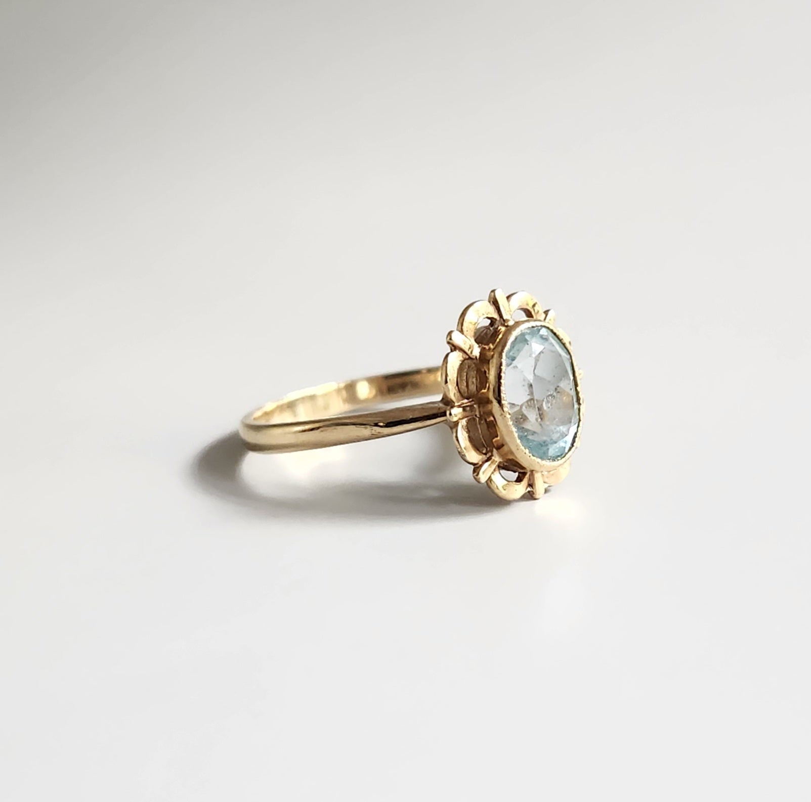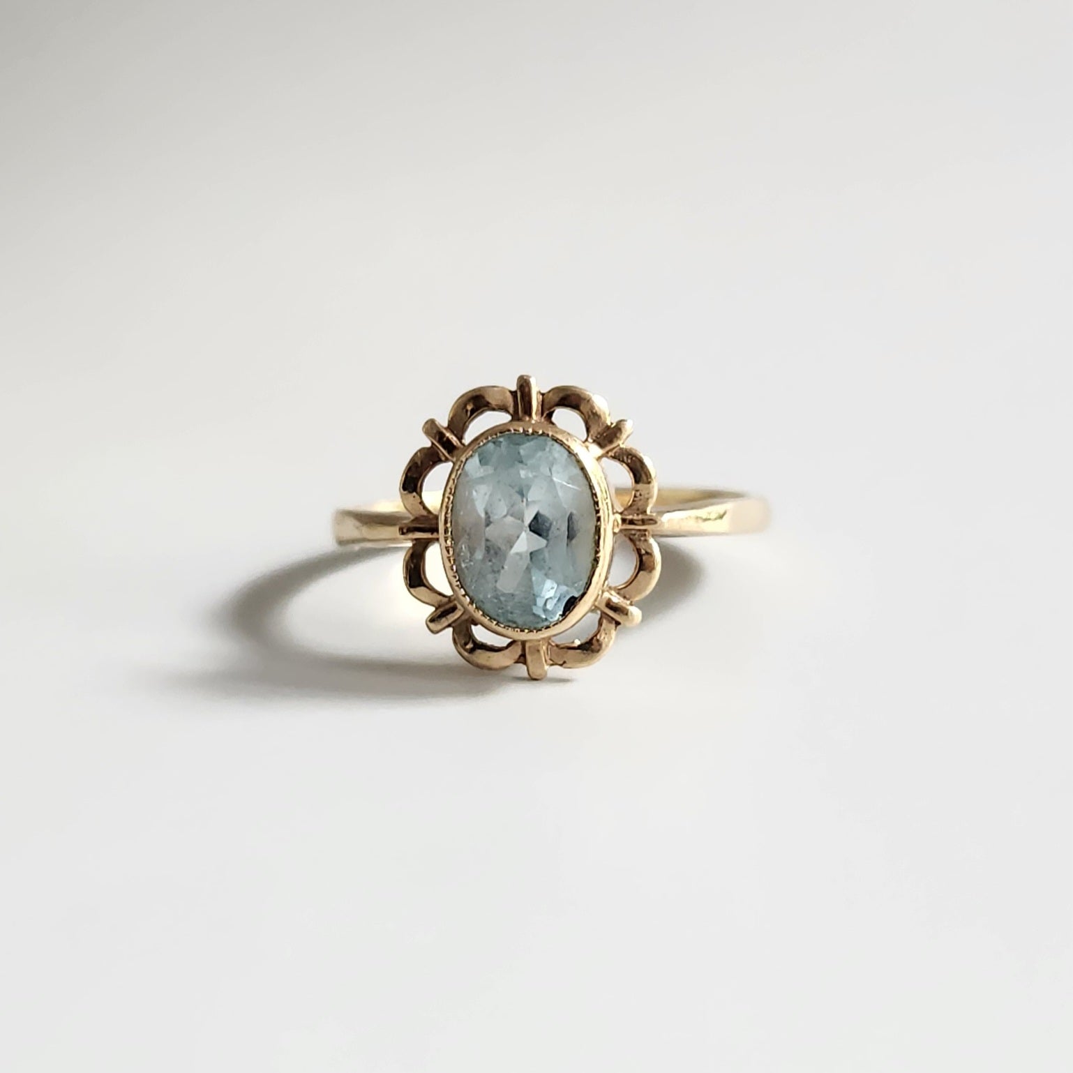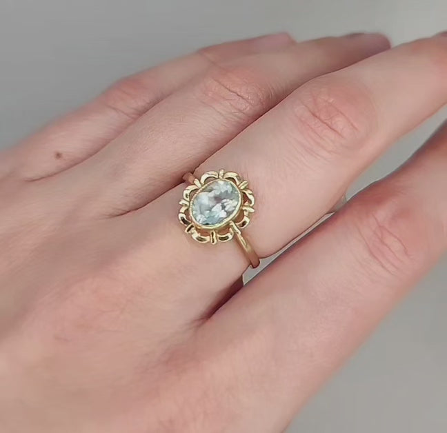 A breathtaking testament to classic elegance, this exquisite 9ct gold ring features a magnificent central 7.8mm by 5.8mm oval cut aquamarine, perfectly framed by intricate gold filigree detailing.