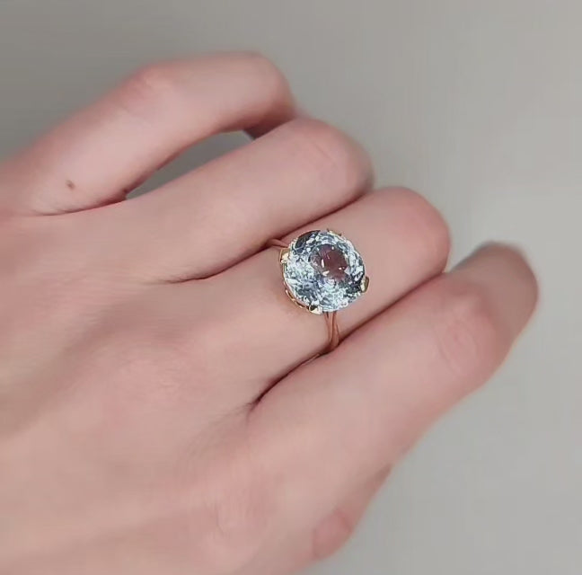 Make a breathtaking statement with this exquisite vintage 9ct gold cocktail ring, beautifully reimagined for the modern era. This captivating piece features a brand new, magnificent 12mm lab created aquamarine, meticulously reset in its original elegant 4-claw setting.