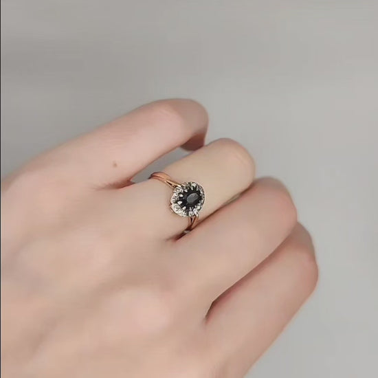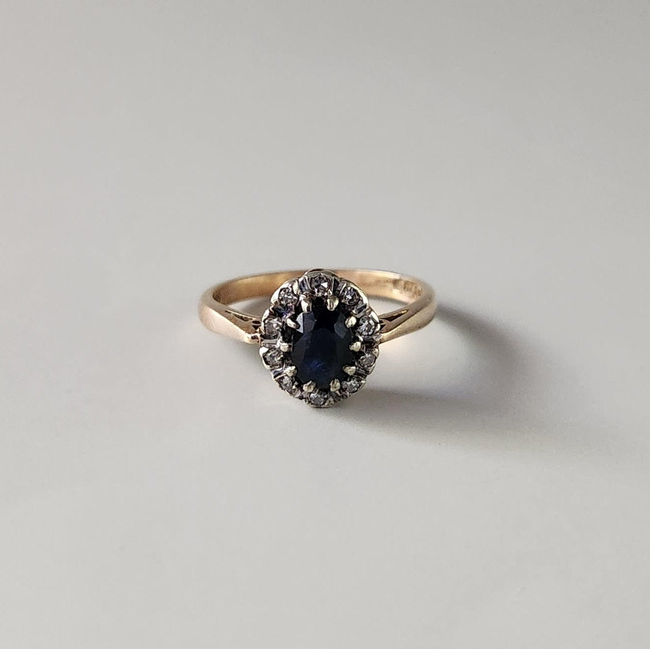 This cluster ring features a 6x5mm oval dark sapphire (0.61ct), surrounded by 10 x 1mm diameter sparkly diamonds (0.05ct).